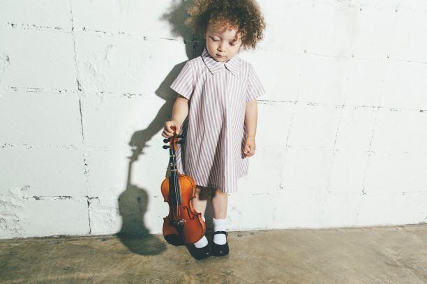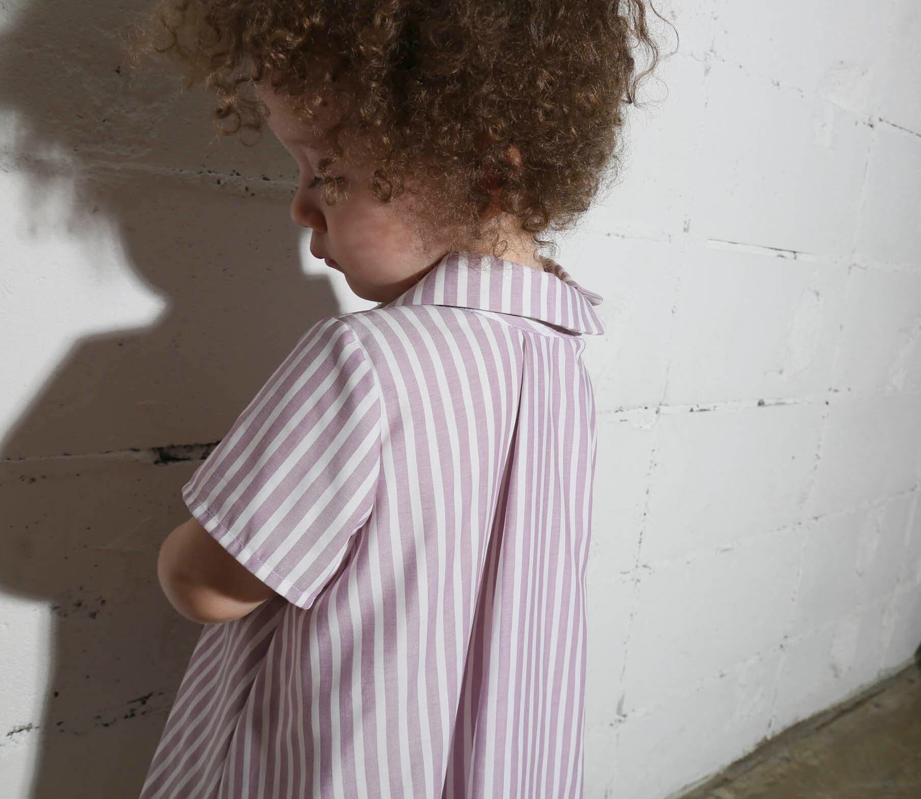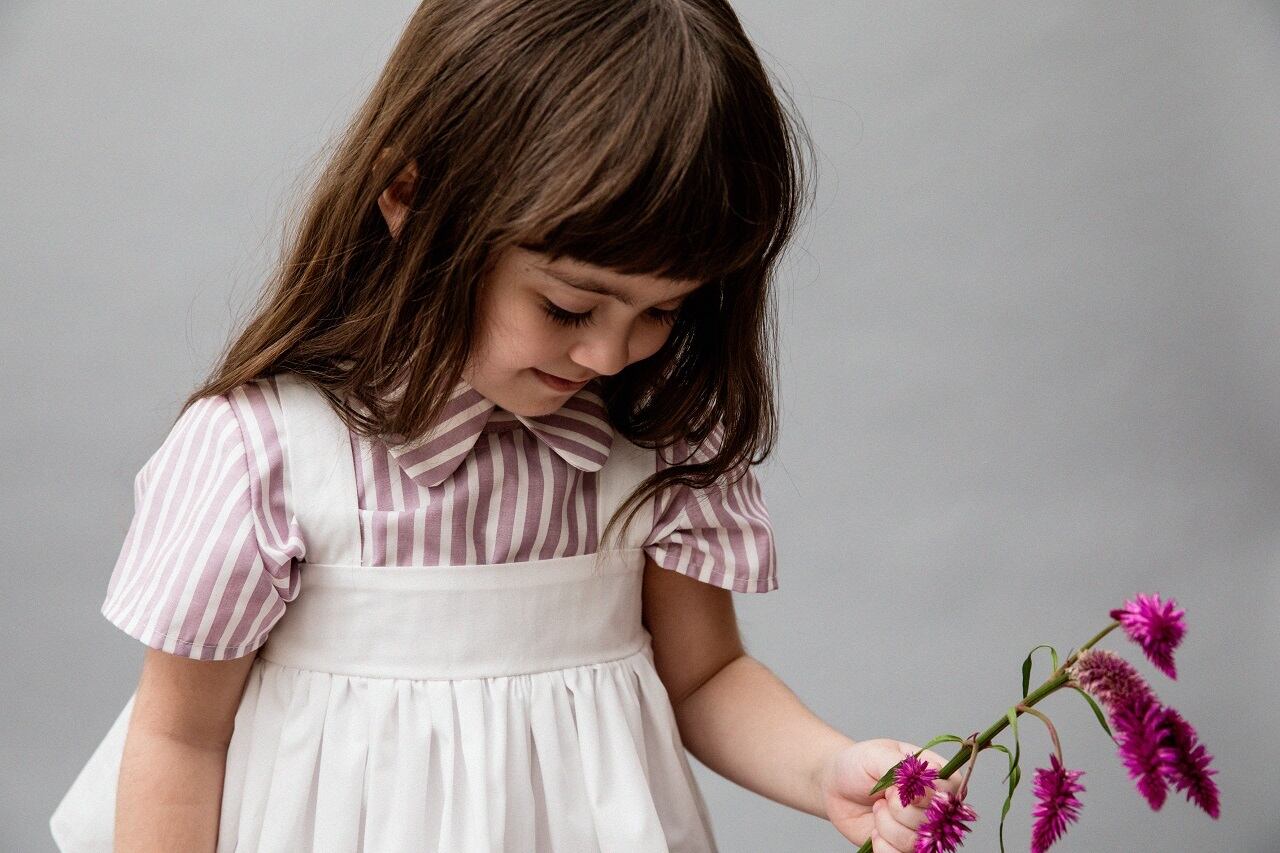 燕尾服をイメージした、きっちり衿とバックの裾が少し長いワンピース。背中のタックに隠れたスナップボタン仕様です。おめかし服としてどこに出てもきちんとしていますが、遊び心もある、TRNKAらしい1着です。