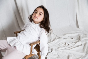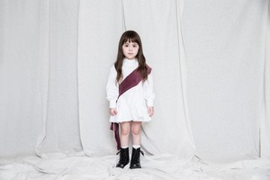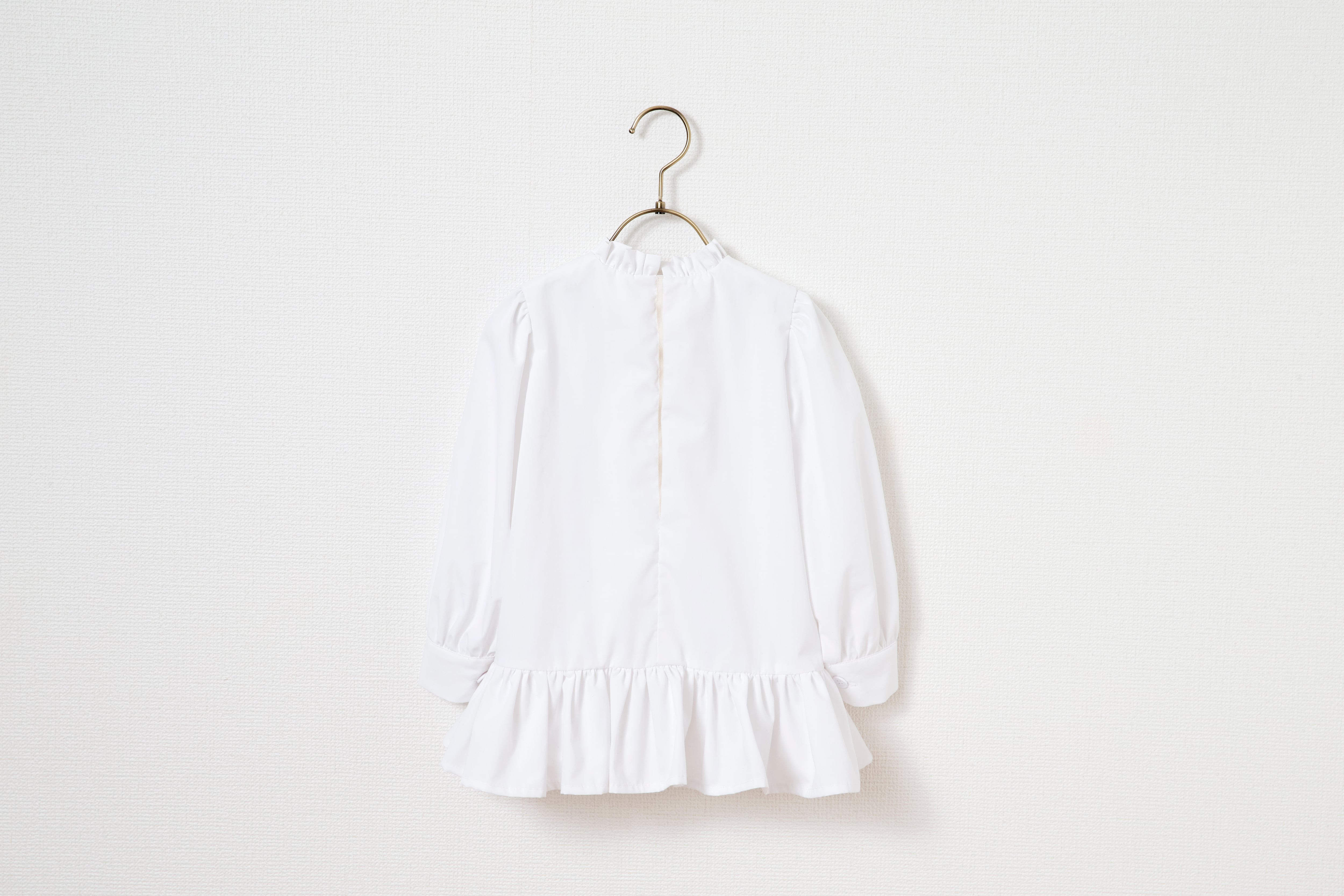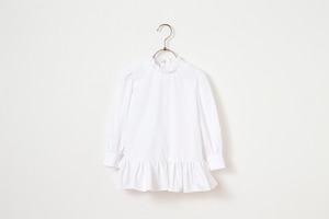 白いワンピース。サイズ大きめ~ジャストサイズで袖がほわりとしたワンピースとして。背が伸びても、ブラウスとして長く着ていただけるお洋服です。お洗濯後にしわになりにくい生地なので、洗濯機(オシャレ着洗い推奨)で洗ってパンっと伸ばして干していただけるイージーケアです。1枚で。パンツやスカートと合わせても。