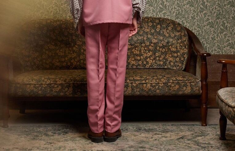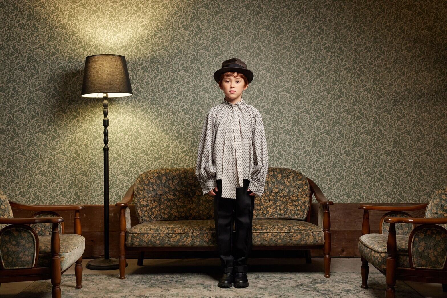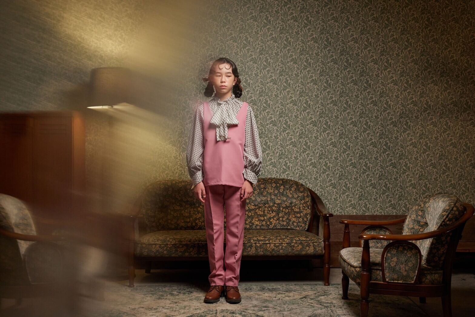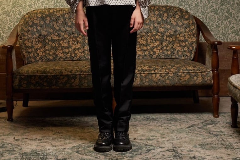 きれいなラインのストレートパンツ。Vネックベストとセットアップできます。