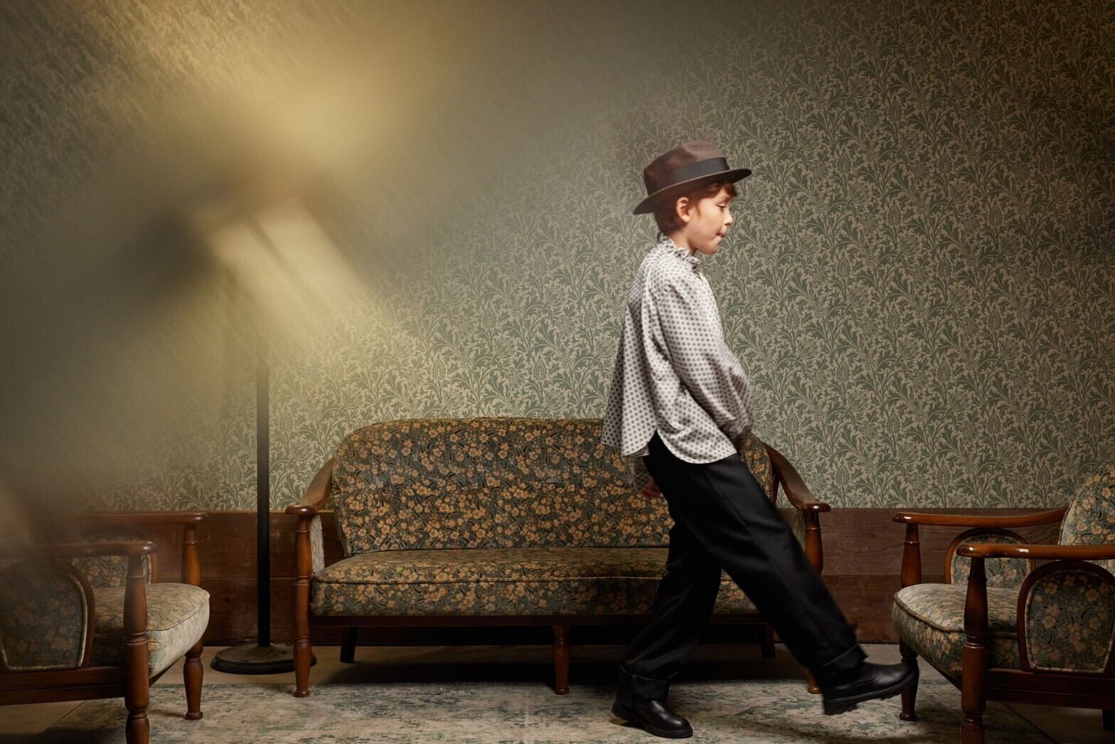 きれいなラインのストレートパンツ。Vネックベストとセットアップできます。