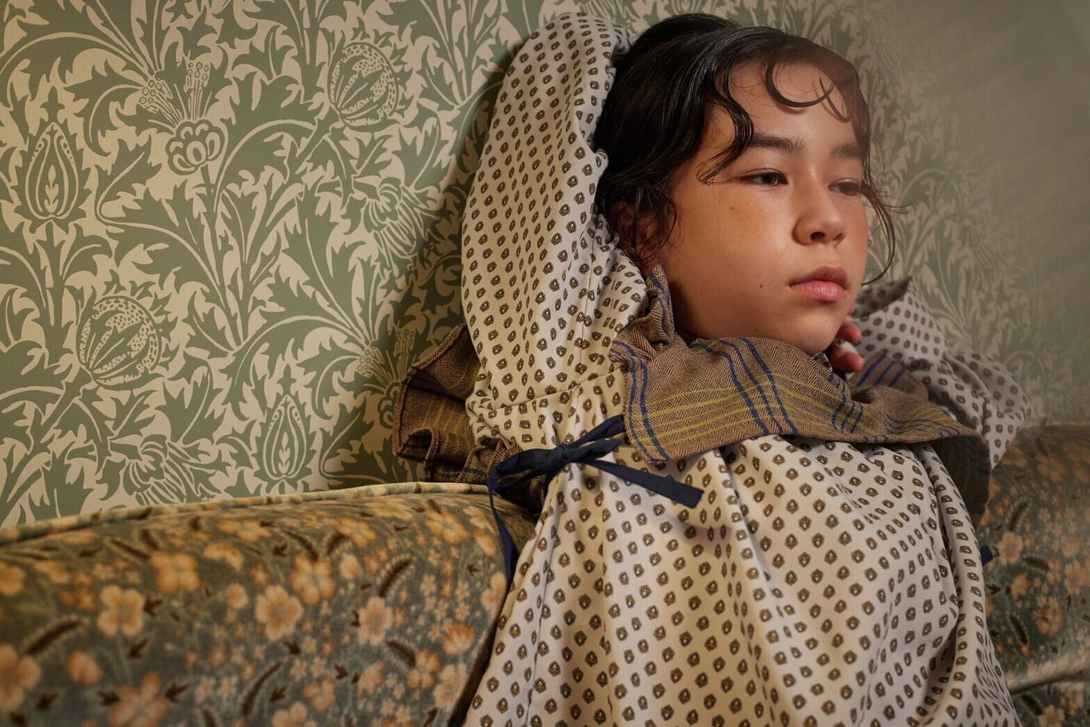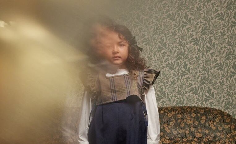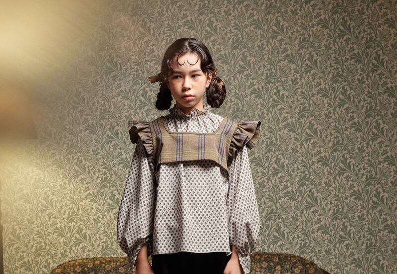 脇でリボンを結ぶ仕様のビスチェです。写真はLサイズ(110~125㎝)を147㎝、105㎝のモデルが着用しています。