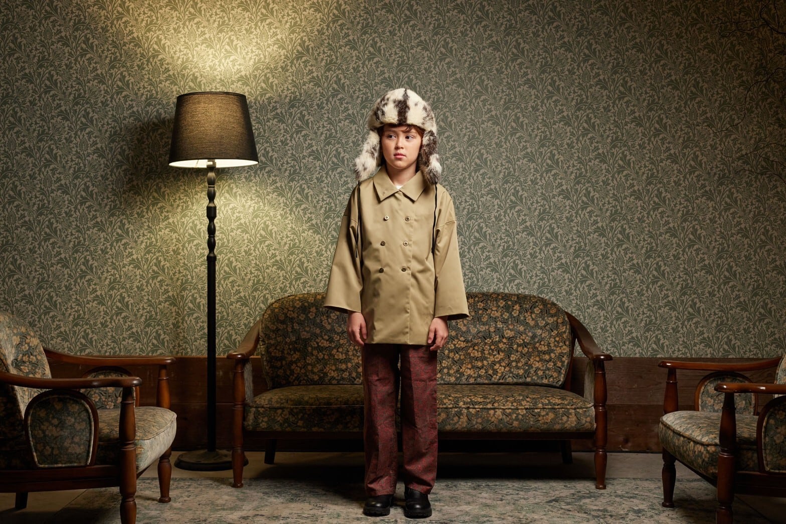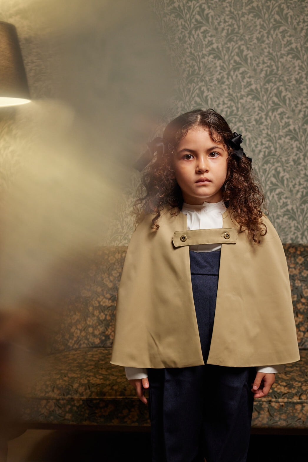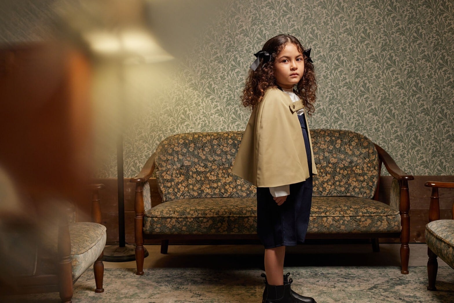 トレンチコートとケープを合わせたようなインヴァネスコート。もともとはスコットランドで雨の時にもバグパイプを守れるように生まれたという雨除けのためのコートなのですが、今回は雨除けではなく、お子様仕様に丈を短くしました。TRNKAの洋服は袖が大きなものも多いので、中に着た袖がもたつかないように、コートの袖はあえて太めにしています。またはケープのみでも。襟の使用は、オープンカラー、ステンカラー、スタンドカラーの3way。