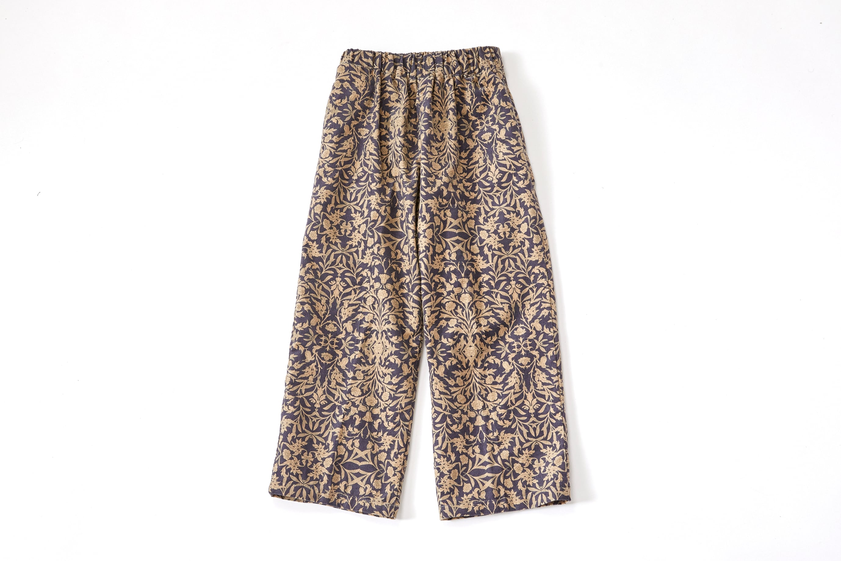 エキゾチックな植物柄のパンツ。コーデュロイになっています。単独はもちろんのこと、同柄でのセットアップ、ジャケットと合わせて三つ揃えとしても使用できる。ウエストは総ゴムでとってもらくちんな履き心地です。
