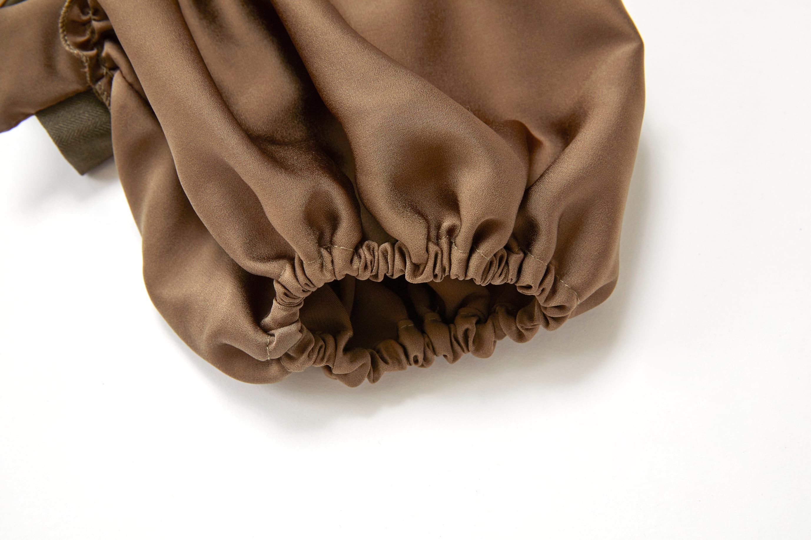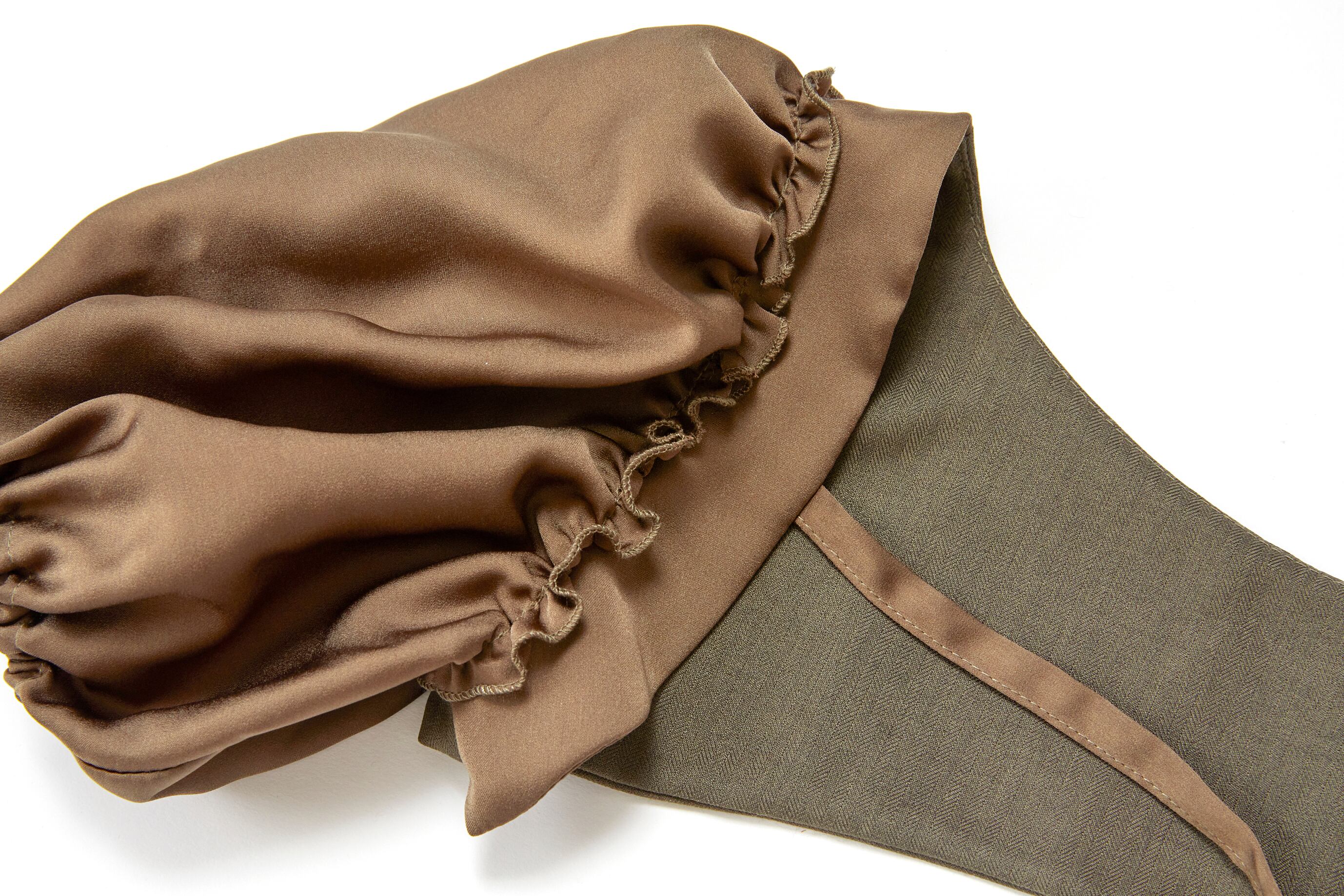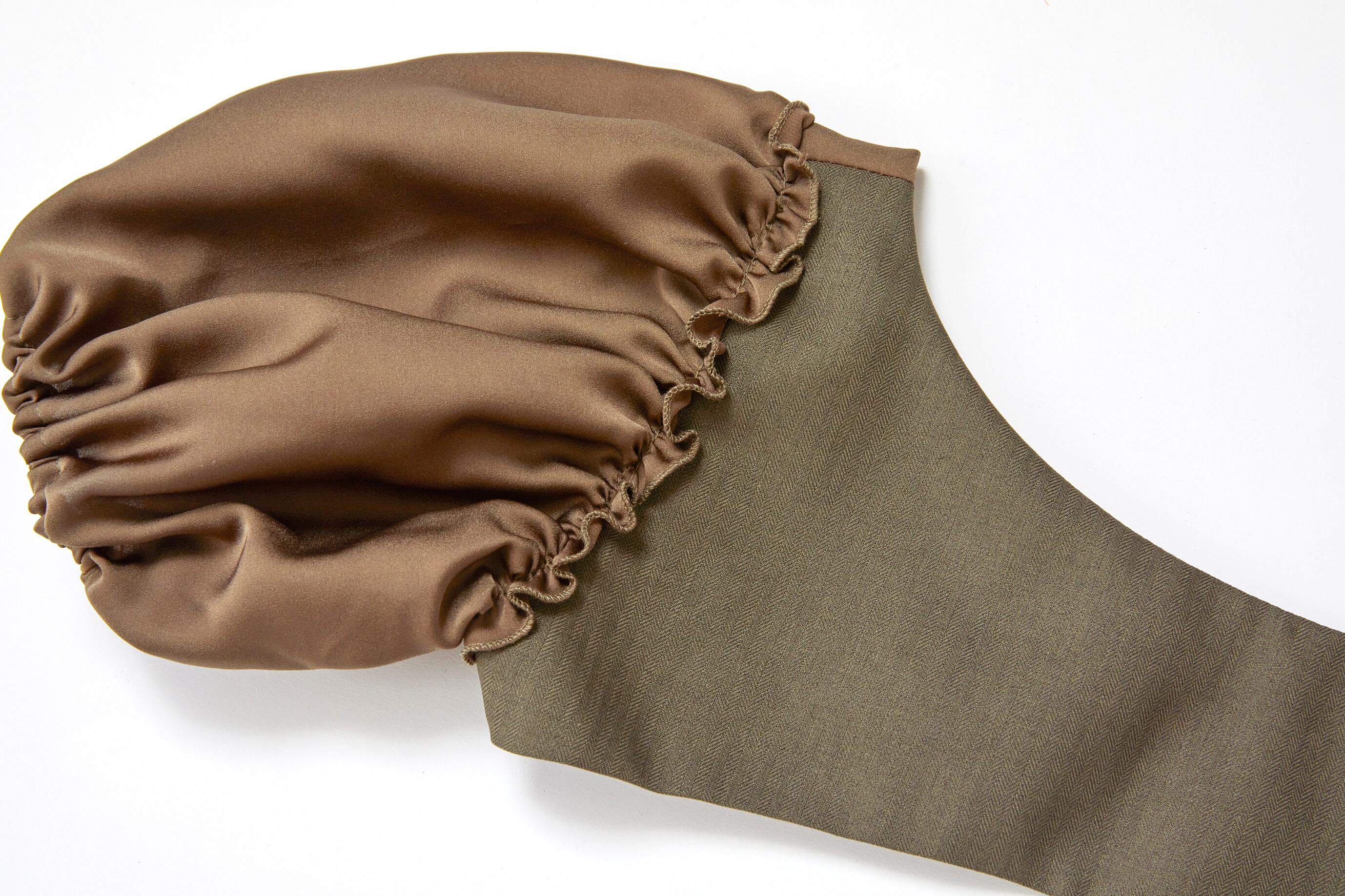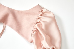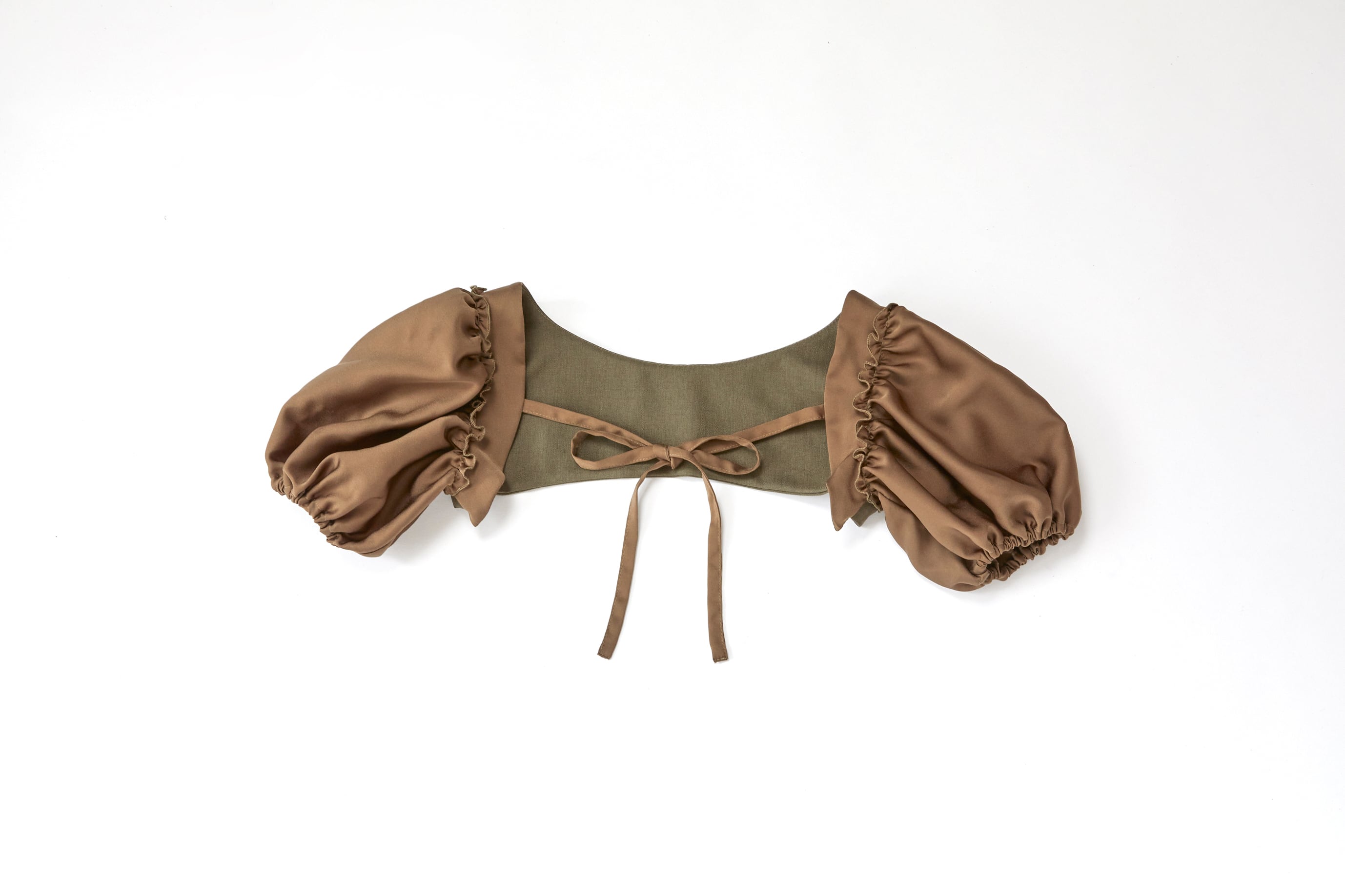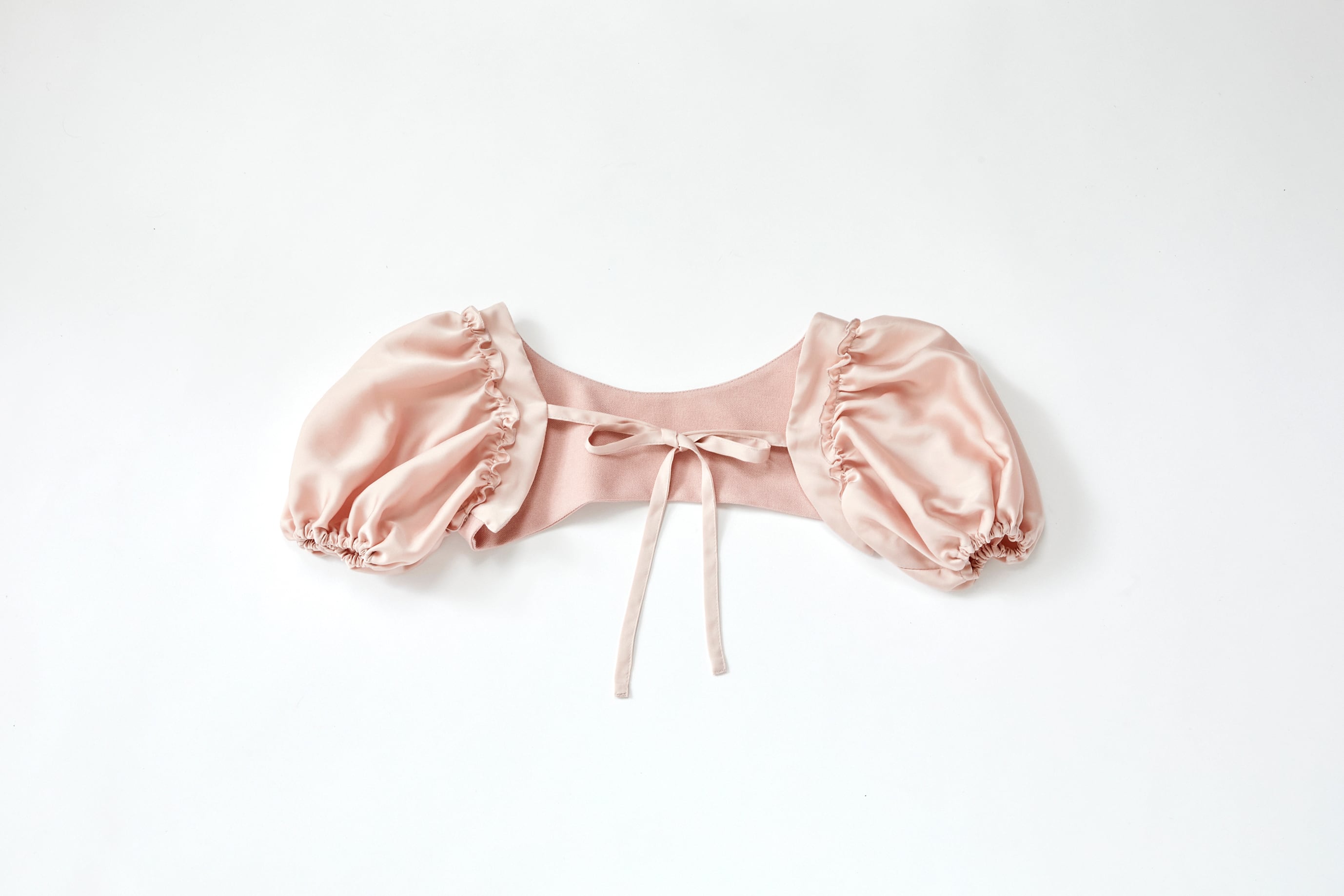 付け袖感覚のボレロです。光沢のある生地で、ガーリーでドレッシーにも、カジュアルに合わせてスパイスとしても合わせられます。通年を通して使えるアイテム。同生地にLong gathered SKあり。セットアップにするとワンピースのように見えます